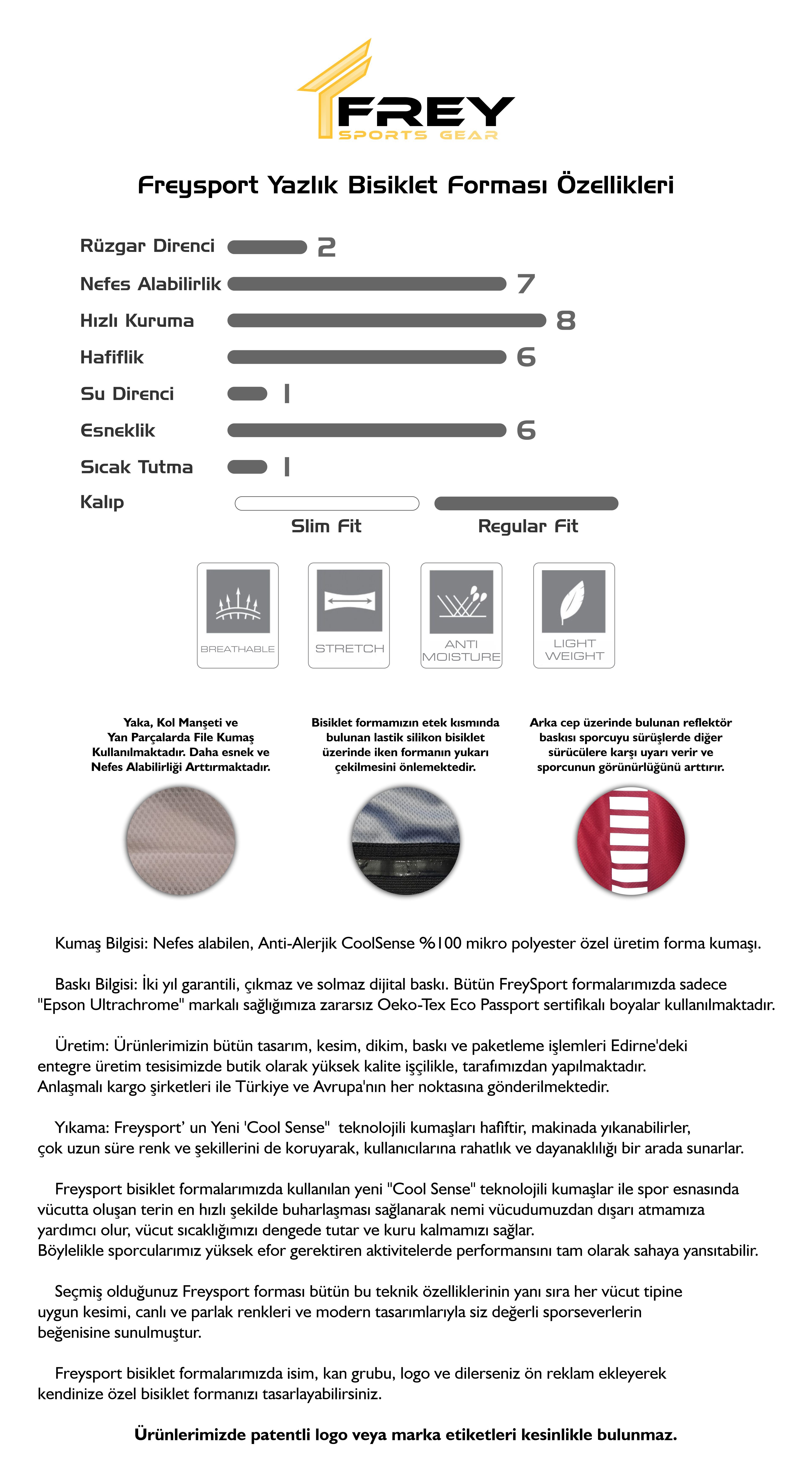 -Kısa kollu -Coolsense yazlık kumaş -Arkada Üç gözlü lastikli cep üzeri Reflektör Baskılar -Ön Tam Boy Fermuarlı -Kol manşetleri, Yaka ve Yan Panellerde Yüksek Nefes Alabilir ve Esnek Mesh Kumaş -Bel kısmında Kaydırmaz Silikon Lastik