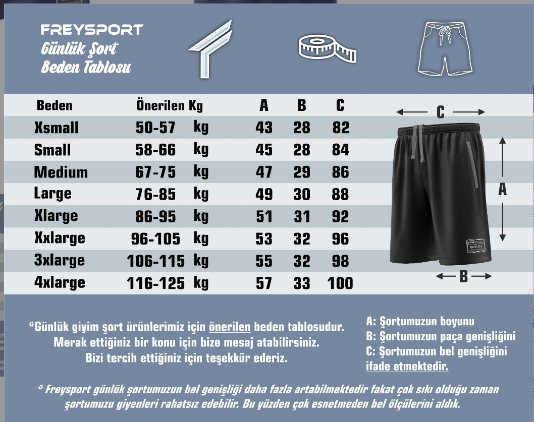 Freysport Günlük Giyim Şortlarımızda birer adet Ön sağ – sol ve arka sağda olmak üzere toplam 3 adet fermuarlı cep standart olarak mevcuttur.  Bel kısmı lastikli ve ekstra ip mevcuttur. Bütün ürünlerimiz en üst kalite %100 polyester kumaş üzerine süblimasyon baskılıdır. Bu baskı yöntemi sayesinde tüm desenler kumaşa işler ve baskılar kumaştan hiçbir şekilde çıkmaz ve solmazlar.