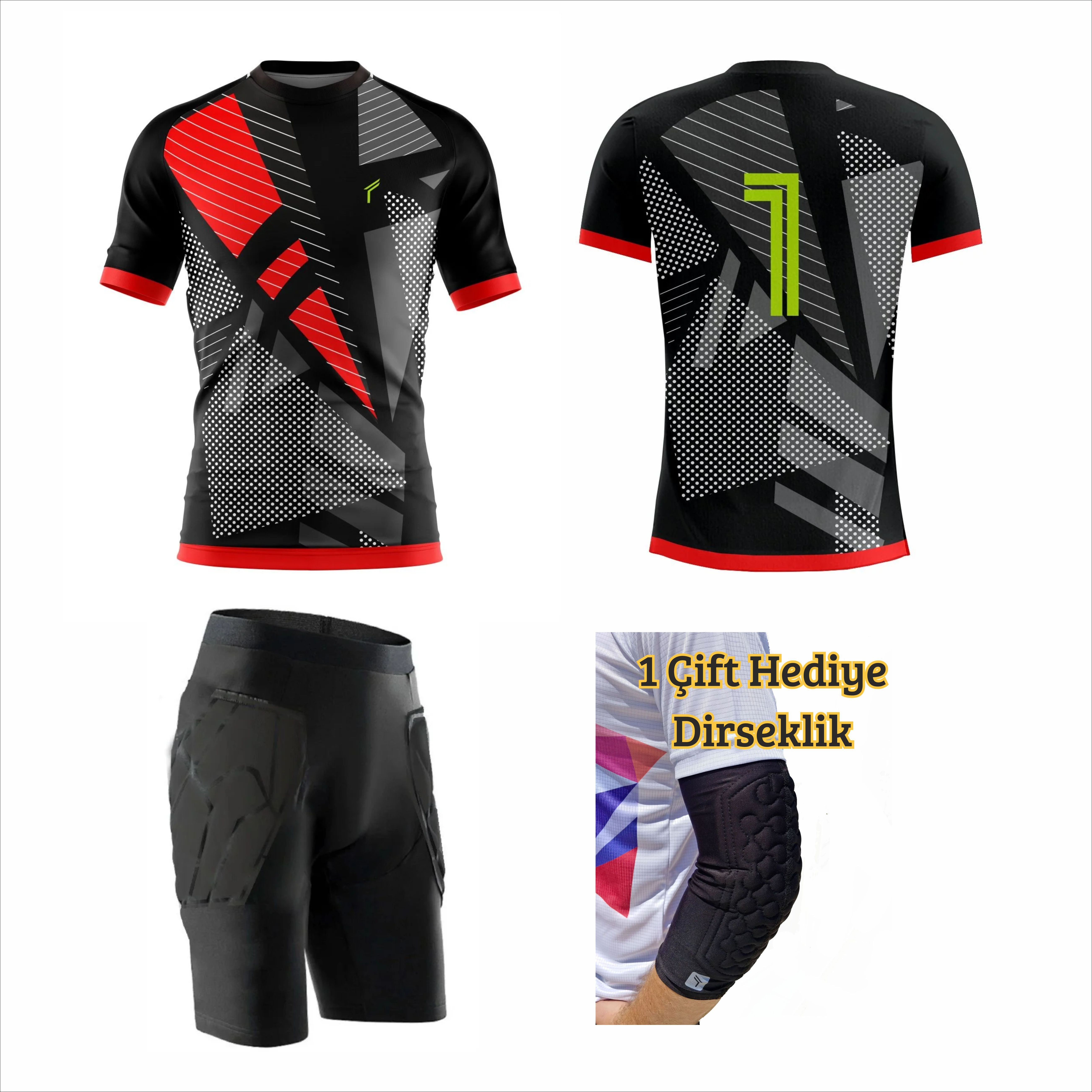 Ürün Bilgisi: Freysport olarak bu setimizde kısa kollu kaleci forması (sünger desteği bulunmuyor), sünger destekli profesyonel kaleci taytı ve 2 adet dirseklik gönderimi yapıyoruz. Görsellerde gözüktüğü şekli ile dirseklik ve kısa kaleci taytında bulunan sünger desteklerini görebilirsiniz.