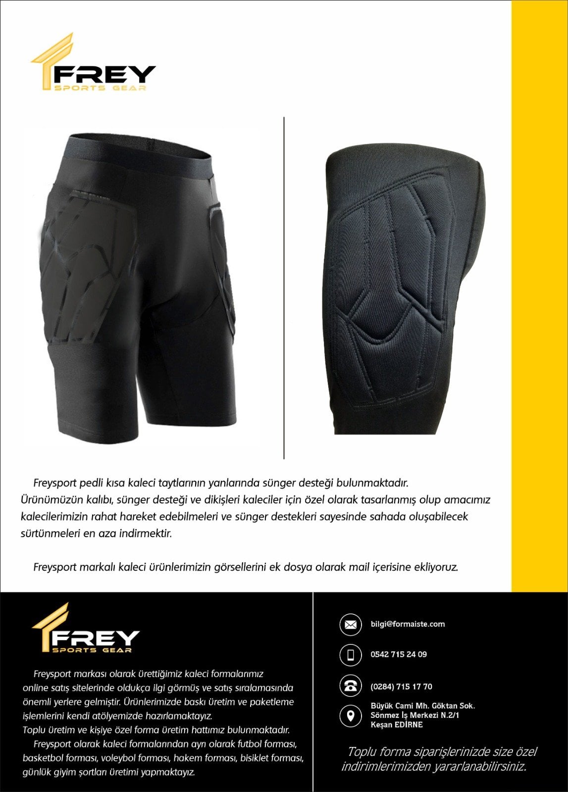 - Kalıp: Dar kesim likralı, bütün kaleci pantolonlarında standart olarak yanlarda ve dizlerde koruyucu sünger paneller vardır. Kumaş: Özel üretim sporcu giyimine uygun nefes alabilen, anti-Alerjik coolsense mikro taktel kumaş. Baskı: Iki yıl garantili, çıkmaz ve solmaz dijital baskı.